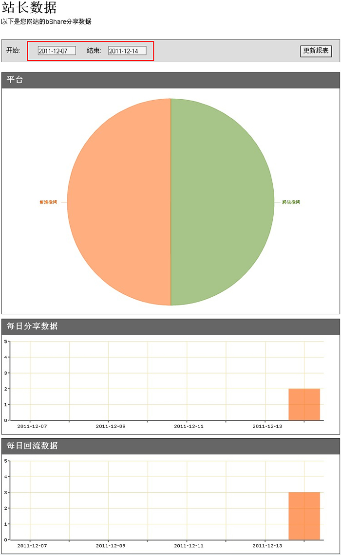 3.注册完成,选择时间区间查看对应时间段bshare分享数据统计报表。